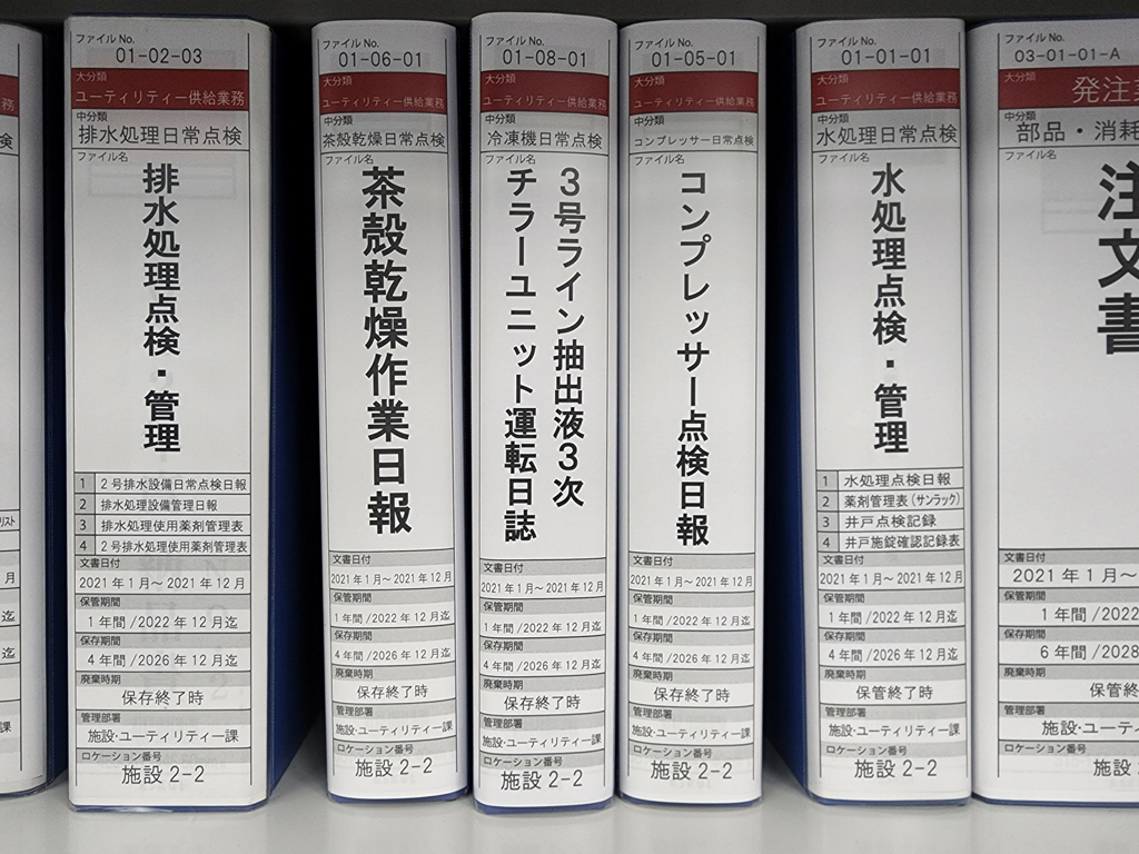 3号ライン抽出液3次チラーユニット運転日報 ユーティリティー供給業務 2022.09.06 ユーティリティー供給業務冷凍機日常点検施設2-2施設2-3業務ファイル ファイルくくり - 中分類(単位業務)ファイル用具 - 厚み - 4cmファイル用具 - 種類 - 2穴パイ保存期間 - 4年保管期間 - 1年原写区分 - 原紙媒体区分 - 紙面 ファイルNo. 01-08-01 ロケーションマップ 製造事務1 製造事務2 FAX複合機 施設4 プリンタOA機器 トレース端末 シュレッダ流し 施設D 生産業務D-1・D-2 備品 冷蔵庫食器棚 施設C 施設A 施設B 共有 施設3施設1 備品 製造事務A 生産業務2 生産業務1 施設2 共有 製造事務3 生産業務A-2 生産業務C-2 生産業務C-1 テー 生産業務A-1 生産業務B-2 生産業務B-1 ブル テプラ 文房具 封筒・伝票 冷温庫