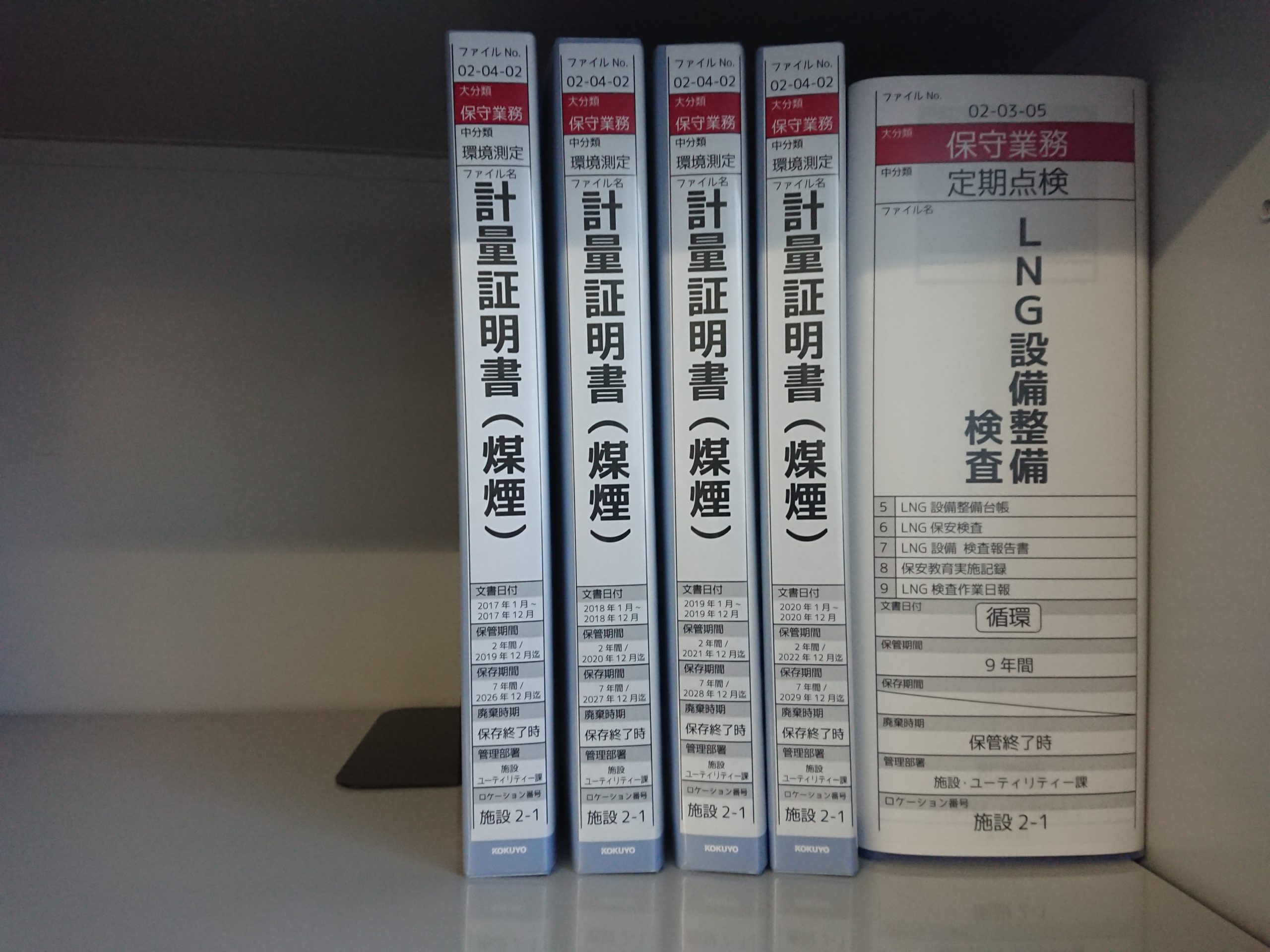 LNG検査作業日報 保守業務 2020.02.25 保守業務定期点検施設1-2業務ファイル ファイルくくり - 中分類(単位業務)ファイル用具 - 厚み - 10cmファイル用具 - 種類 - 2穴パイ保存期間 - なし保管期間 - 9年原写区分 - 原紙媒体区分 - 紙面循環ファイル - 循環 ファイルNo. 02-03-09 ロケーションマップ 製造事務1 製造事務2 FAX複合機 施設4 プリンタOA機器 トレース端末 シュレッダ流し 施設D 生産業務D-1・D-2 備品 冷蔵庫食器棚 施設C 施設A 施設B 共有 施設3施設1 備品 製造事務A 生産業務2 生産業務1 施設2 共有 製造事務3 生産業務A-2 生産業務C-2 生産業務C-1 テー 生産業務A-1 生産業務B-2 生産業務B-1 ブル テプラ 文房具 封筒・伝票 冷温庫