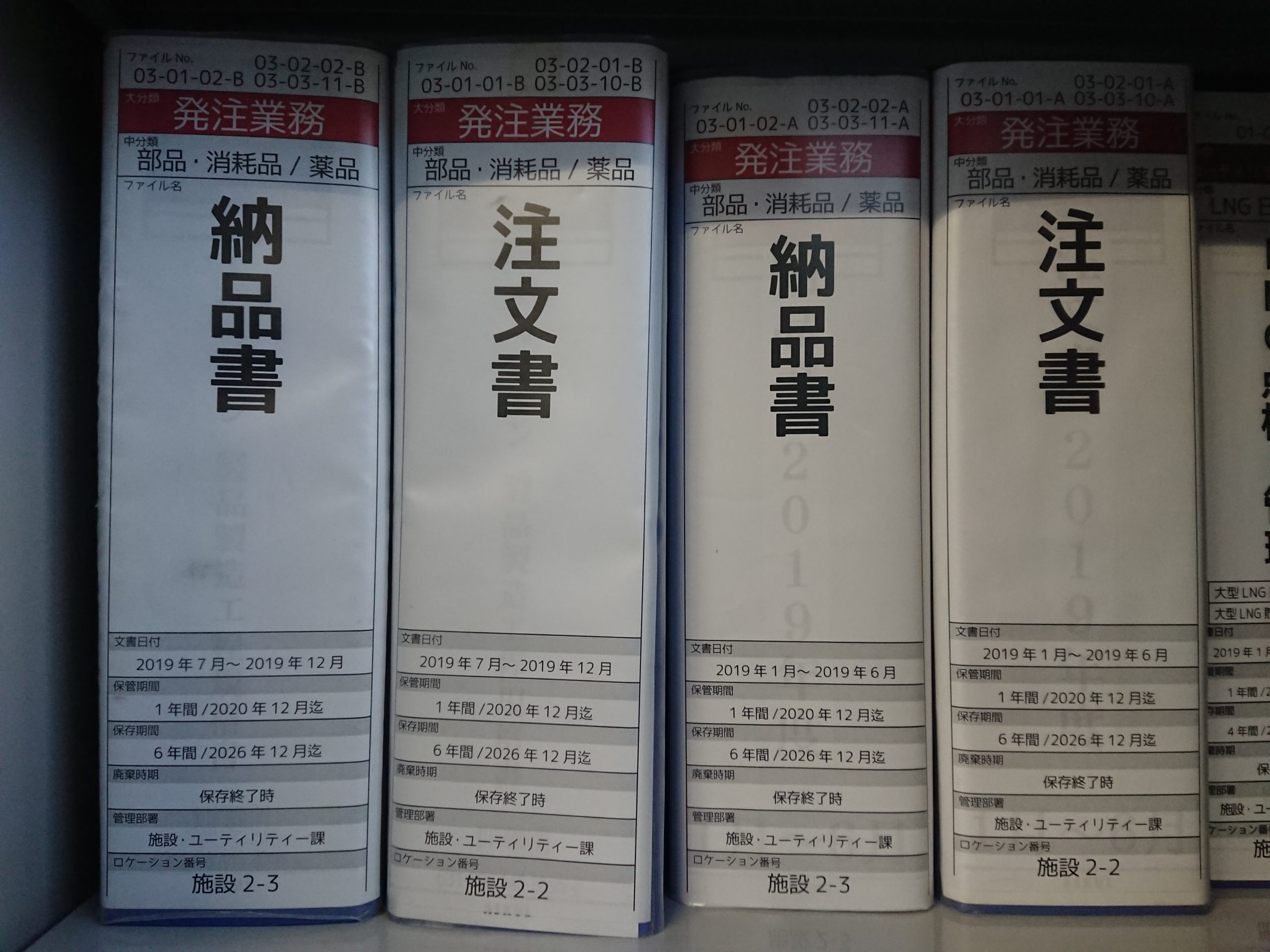 注文書 施設2-2 2020.02.26 施設2-2施設2-3業務ファイル発注業務薬品 ファイルくくり - 中分類(単位業務)ファイル用具 - 厚み - 8cmファイル用具 - 種類 - 2穴パイ保存期間 - 6年保管期間 - 1年原写区分 - 原紙媒体区分 - 紙面媒体区分 - 電子データ ファイルNo. 03-02-01 電子データフォルダ \\192.168.32.224\3_生産本部\第二工場\第二施設\03_発注業務\02_薬品\01_注文書 ロケーションマップ 製造事務1 製造事務2 FAX複合機 施設4 プリンタOA機器 トレース端末 シュレッダ流し 施設D 生産業務D-1・D-2 備品 冷蔵庫食器棚 施設C 施設A 施設B 共有 施設3施設1 備品 製造事務A 生産業務2 生産業務1 施設2 共有 製造事務3 生産業務A-2 生産業務C-2 生産業務C-1 テー 生産業務A-1 生産業務B-2 生産業務B-1 ブル テプラ 文房具 封筒・伝票 冷温庫