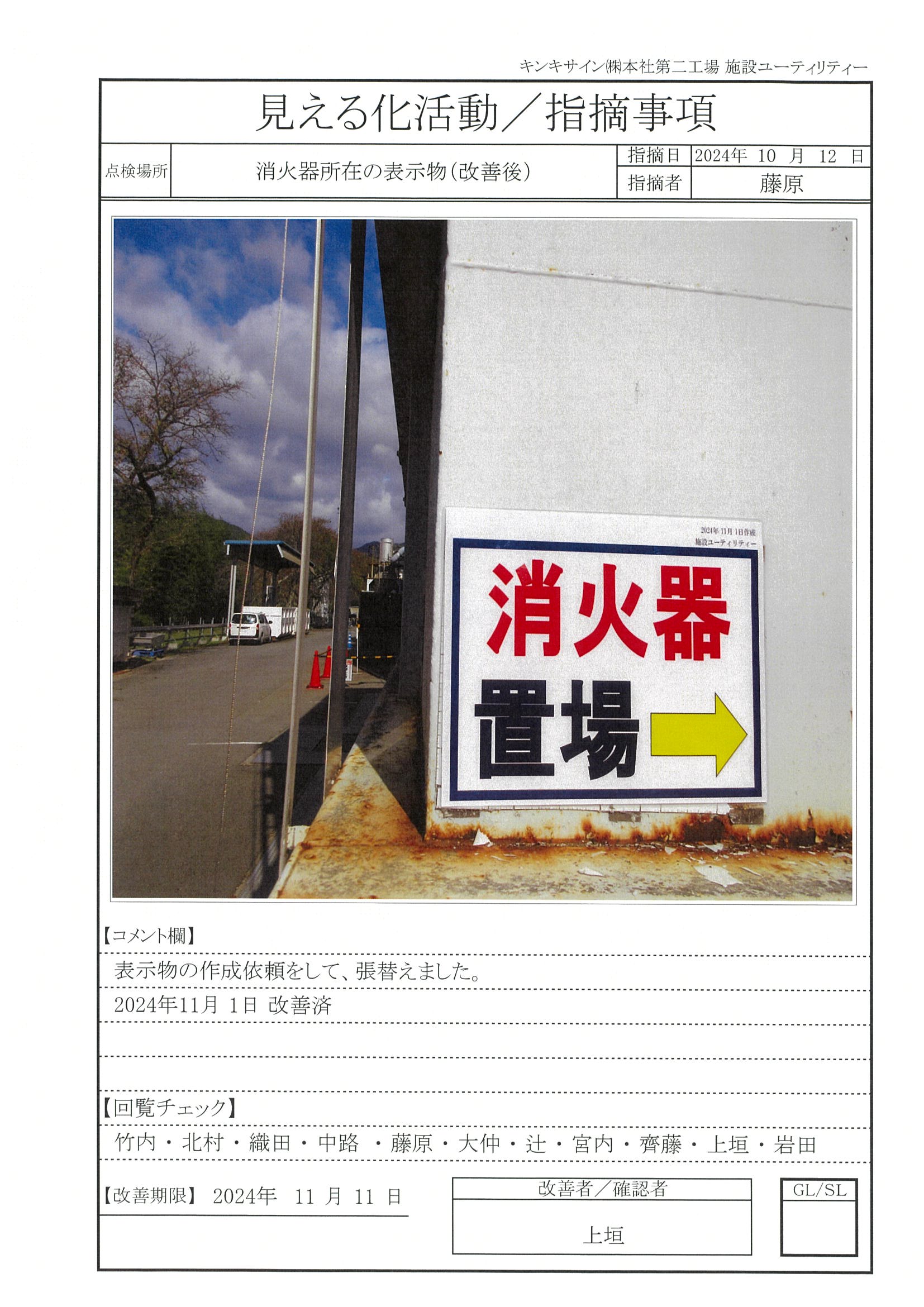 指摘事項―2024年10月12日 指摘事項 2024.10.21 指摘事項 2024年 目次 消化器所在の表示物改善前改善後 消化器所在の表示物 改善前 改善期限 2024月11月11日 改善後 改善日 2024月11月1日