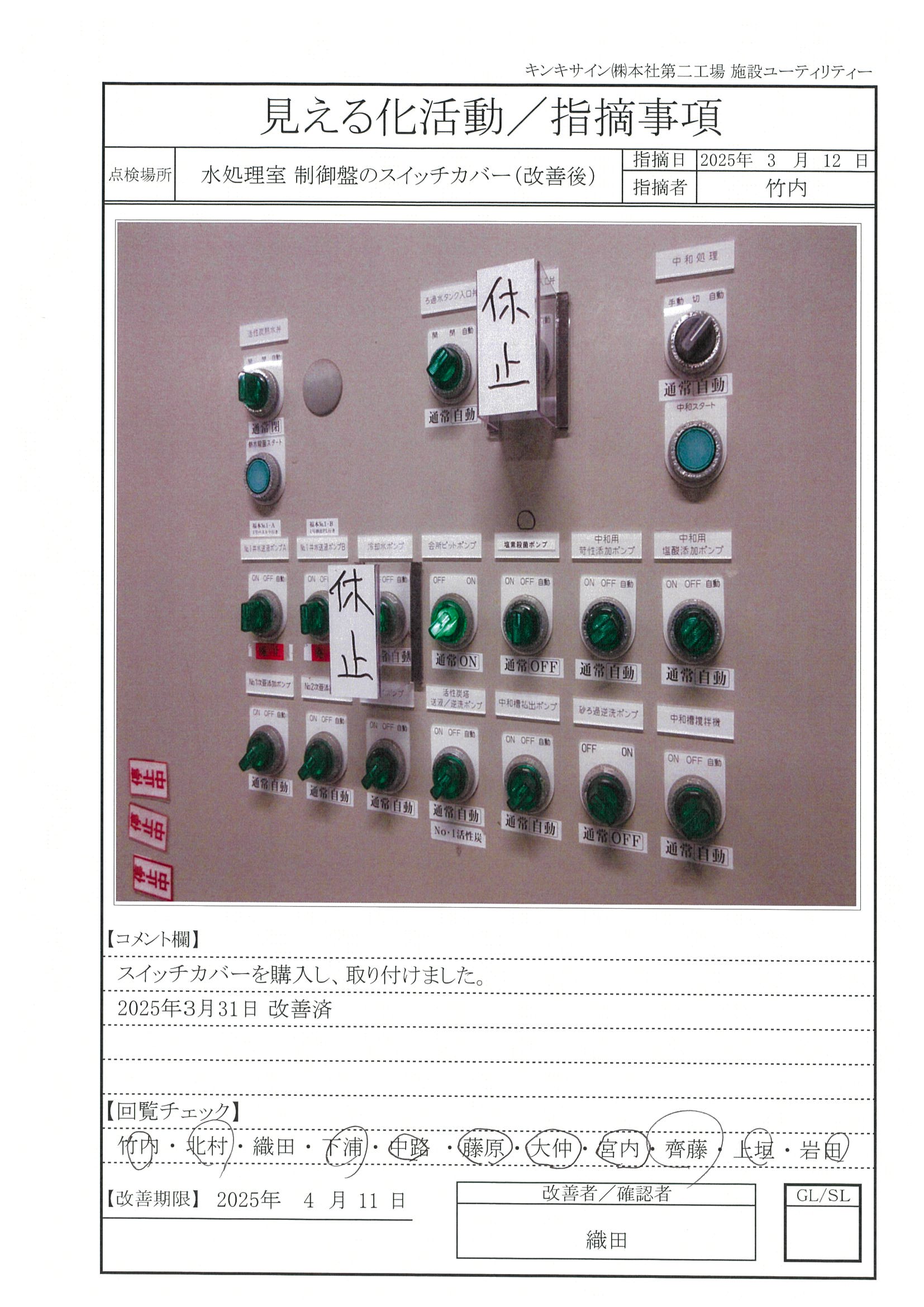 指摘事項―2025年3月12日 指摘事項 2025.06.10 指摘事項 2025年 目次 水処理室 制御盤のスイッチカバー改善前改善後 水処理室 制御盤のスイッチカバー 改善前 改善期限 2025月4月11日 改善後 改善日 2025月3月31日
