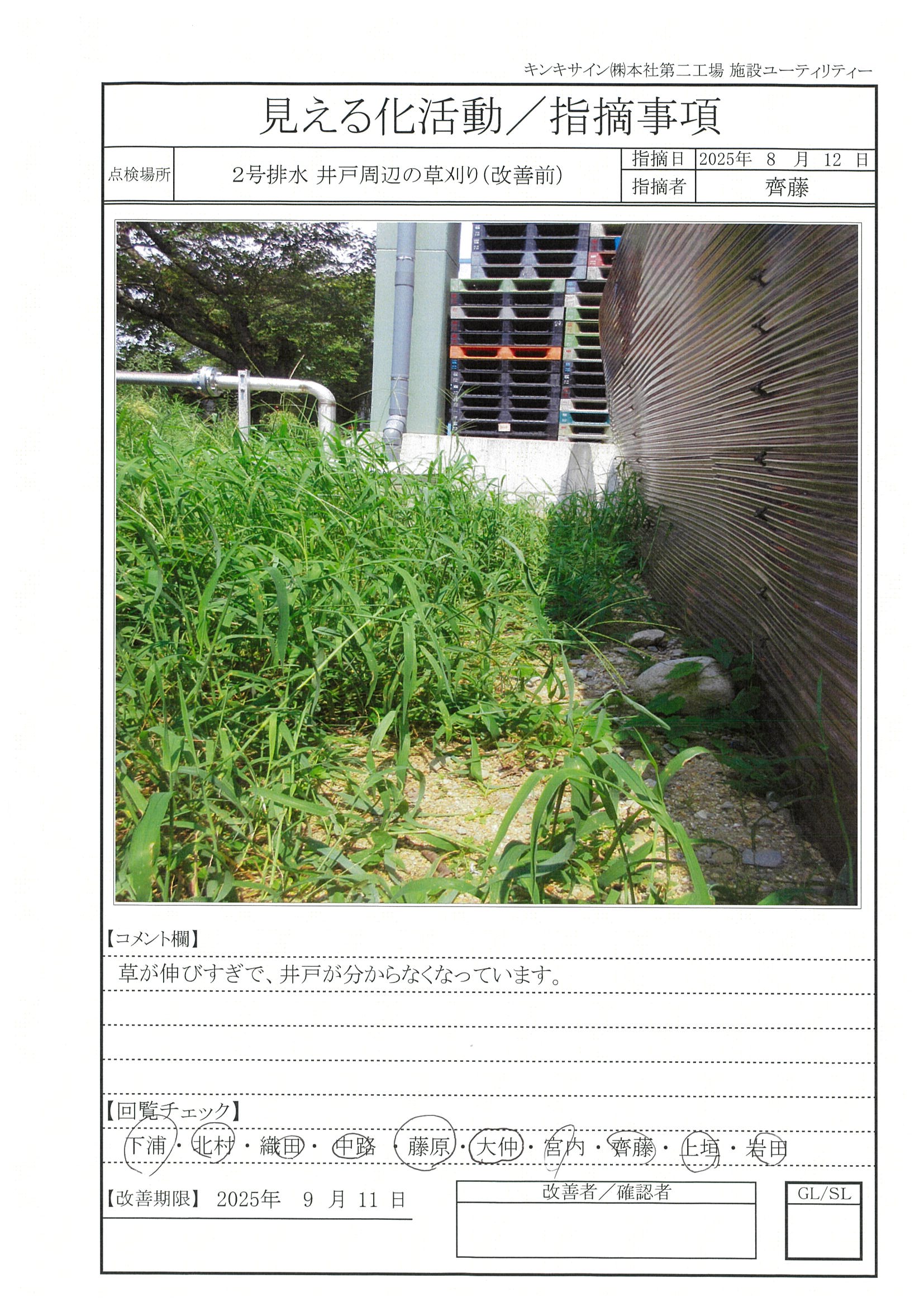 指摘事項―2025年8月12日 指摘事項 2025.10.17 指摘事項 2025年 目次 2号排水 井戸周辺の草刈り改善前改善後 2号排水 井戸周辺の草刈り 改善前 改善期限 2025月9月11日 改善後 改善日 2025月8月29日